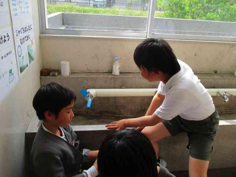友達のためにバケツに水を汲んでかけてあげる姿が見られました。
