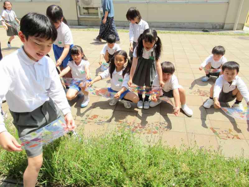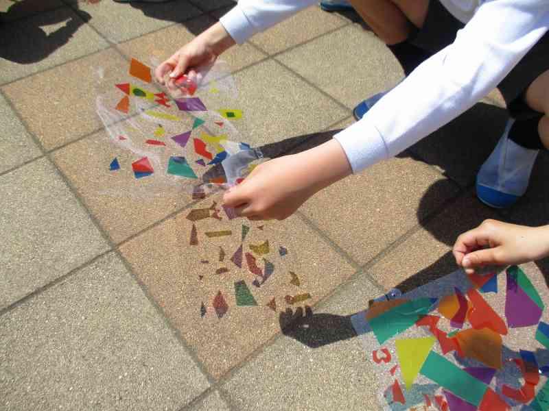 出来上がった作品を太陽に当て、地面にうつるカラフルな色の模様を楽しんでいました。