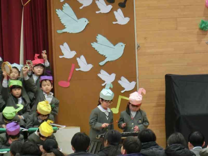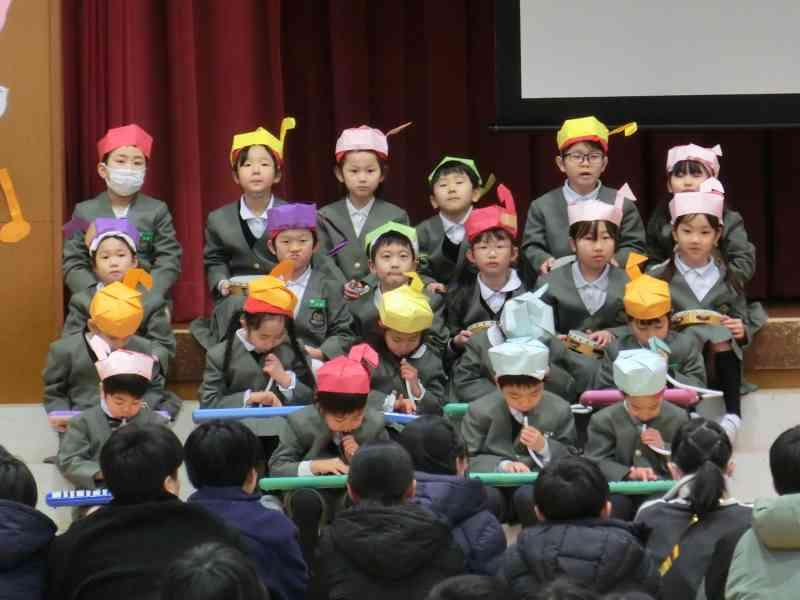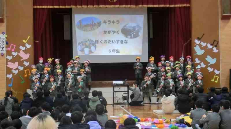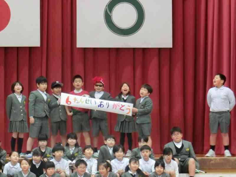 1年生は、6年生に感謝の気持ちとエールを伝えるために、チャイムの音で作った歌をプレゼントしました。6年生との思い出をふり返りながら、1年生全員でつくりあげた歌です。