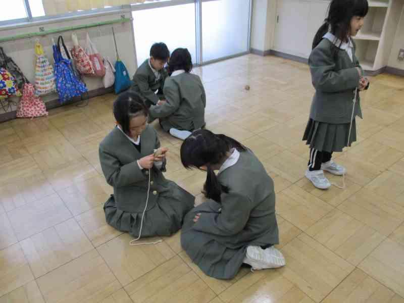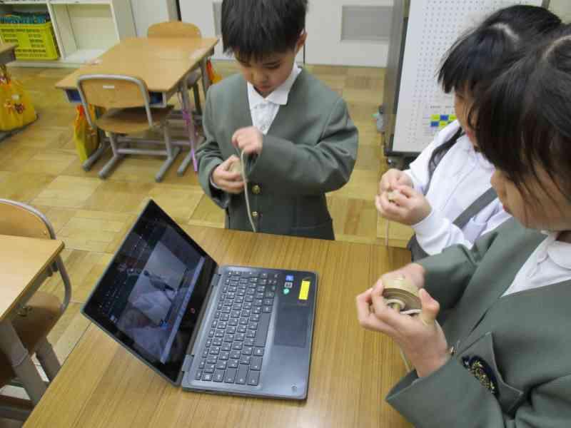 生活科の学習では、むかしあそびに挑戦しています!動画を見たり、コツを友達に聞きながら、上達を目指しています。