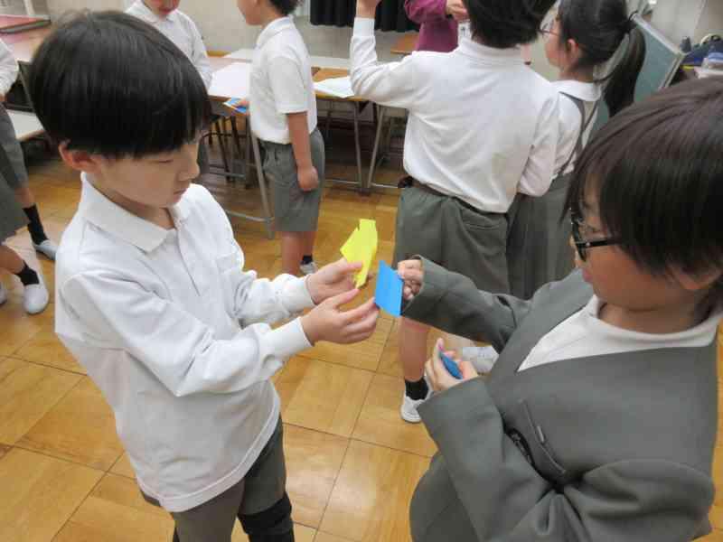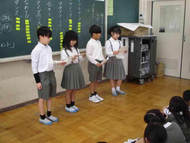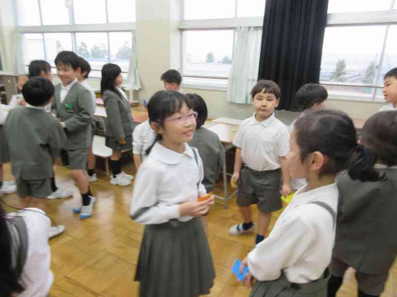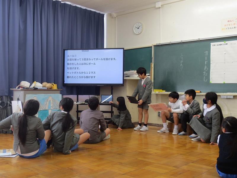 1学期から総合の時間の中で、一から自分たちで遊びを考案し準備を進めてきました。当日、保護者の方や全校に紹介する前は、「緊張する」「みんなにうまく伝わるかな」と心配する様子も見られましたが、5限後には、「うまく説明できた」「楽しかったと言ってもらえた」と笑顔で話してくれました。4年生本当によくがんばりました!!
