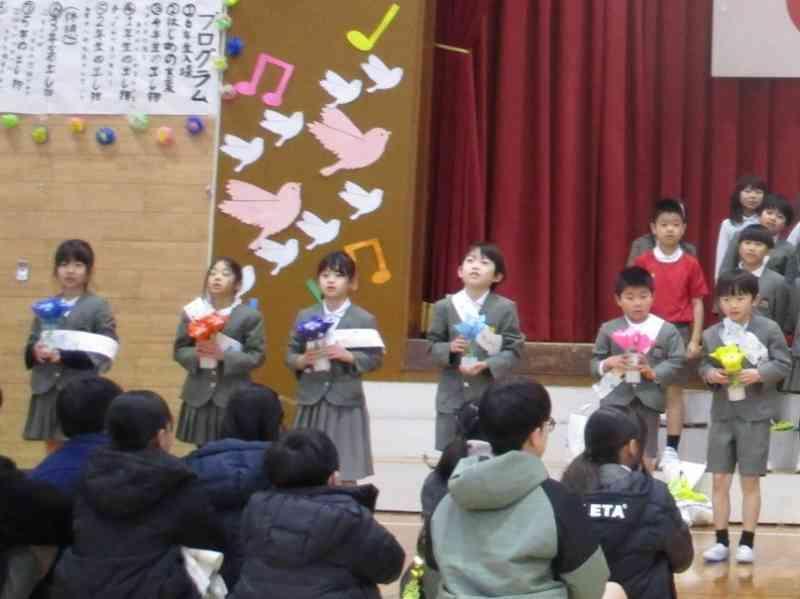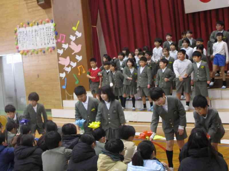 最後に、「にじ」を全員で歌い、虹色の花を6年生にプレゼントしました。