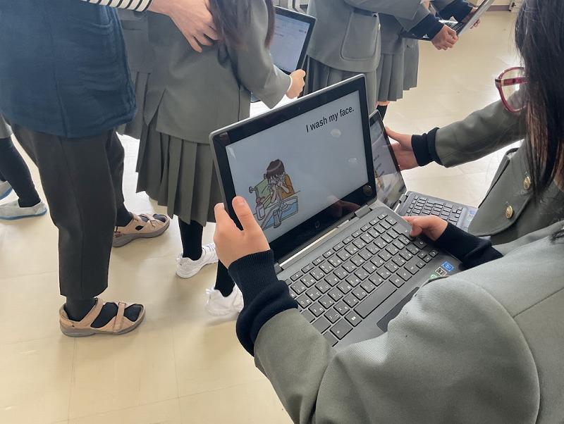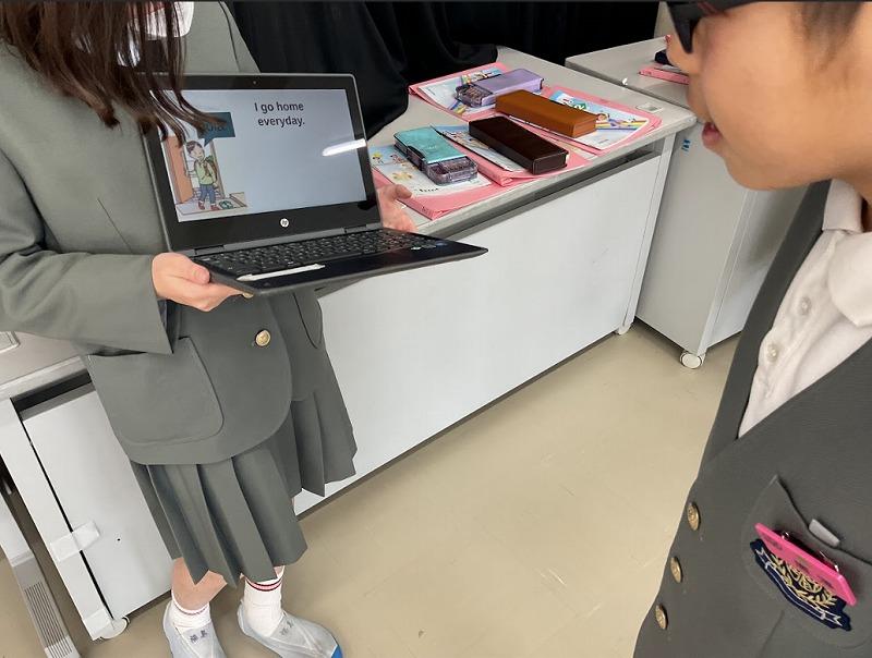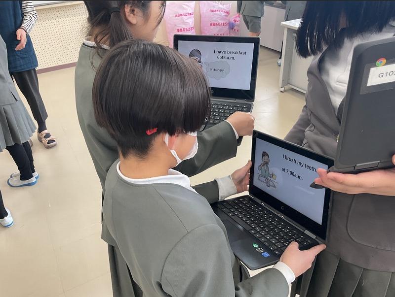 英語で伝えることに苦労しながらも、スライドを見せながら上手に自分の日課を紹介していました。中には、時間や頻度を表す言葉も入れながら自分の日課を紹介する様子も見られ、とても素敵でした。