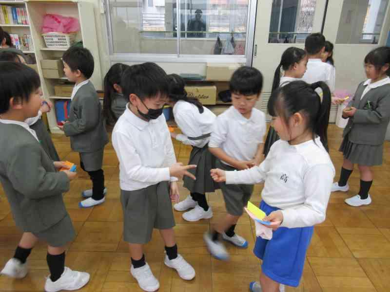 また、コミュニケーションタイムとして「カラフルカード集め」を行いました。カード交換をするなかで、自分の名前や好きな食べ物、スポーツなどお互いのことを伝え合いました。