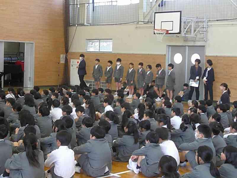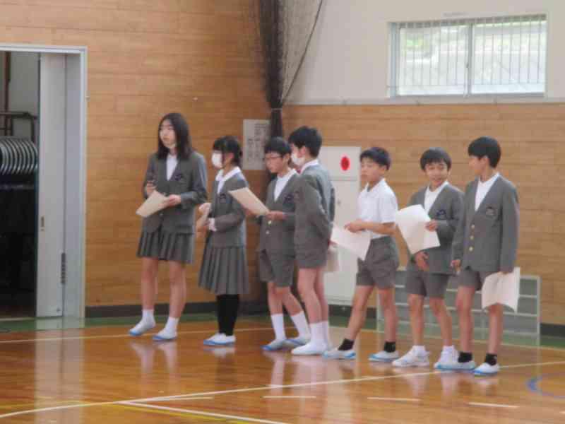 企画委員会の進行のもと、学級目標と、学級代表として頑張りたいことを全校の前で発表しました。