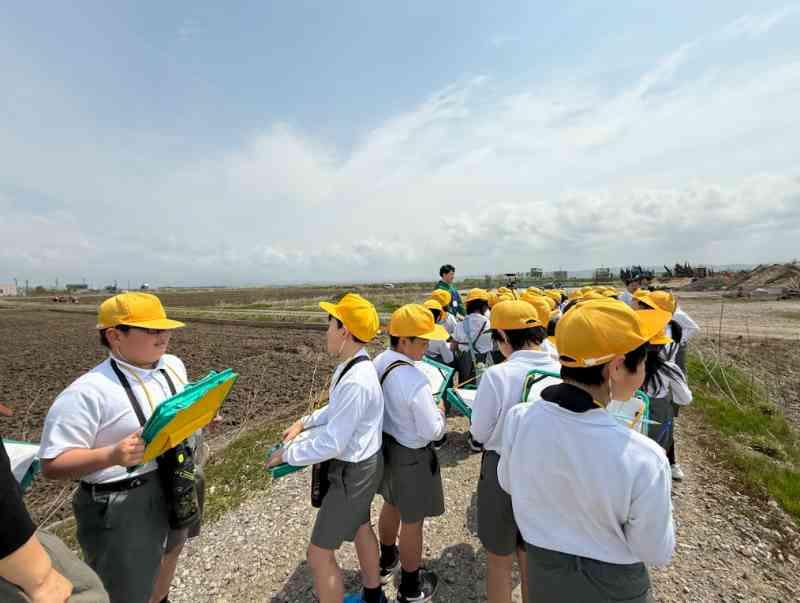 社会の学習で、学校の周りの様子を探検しました。今回は東・南エリアです。学校の周りには住宅地や田んぼ、スーパー、中学校など、地域を支える建物や交通、自然などがたくさんありました。
