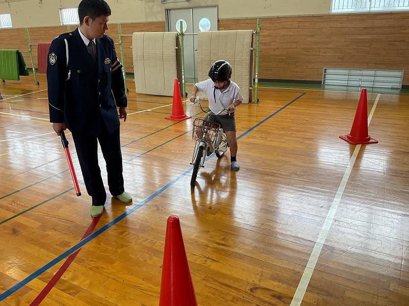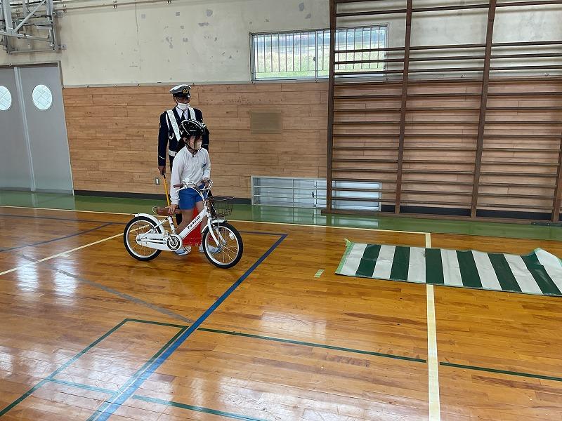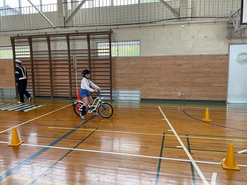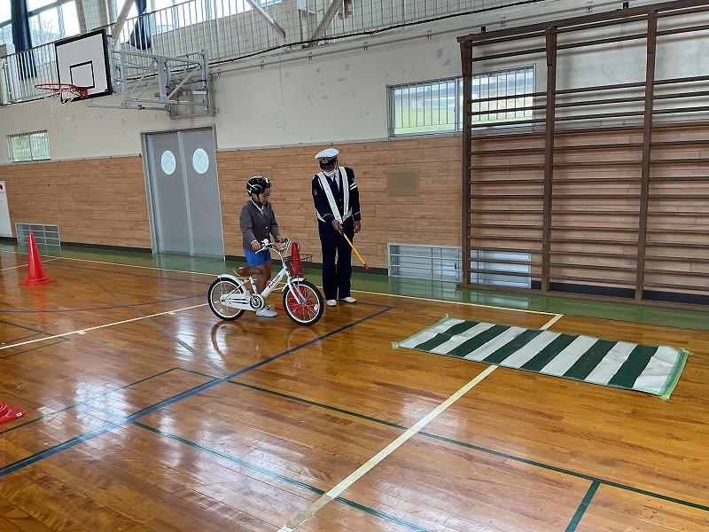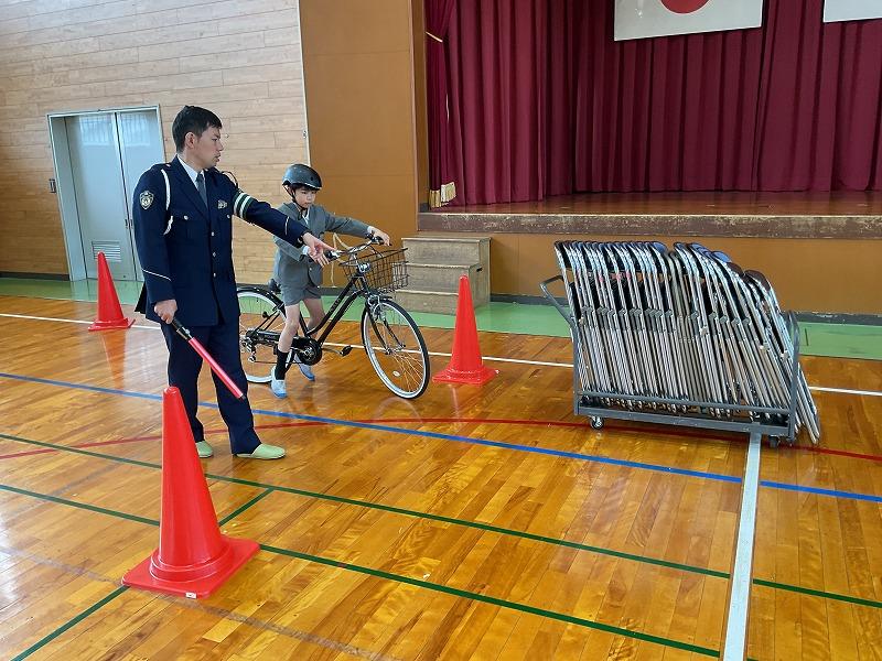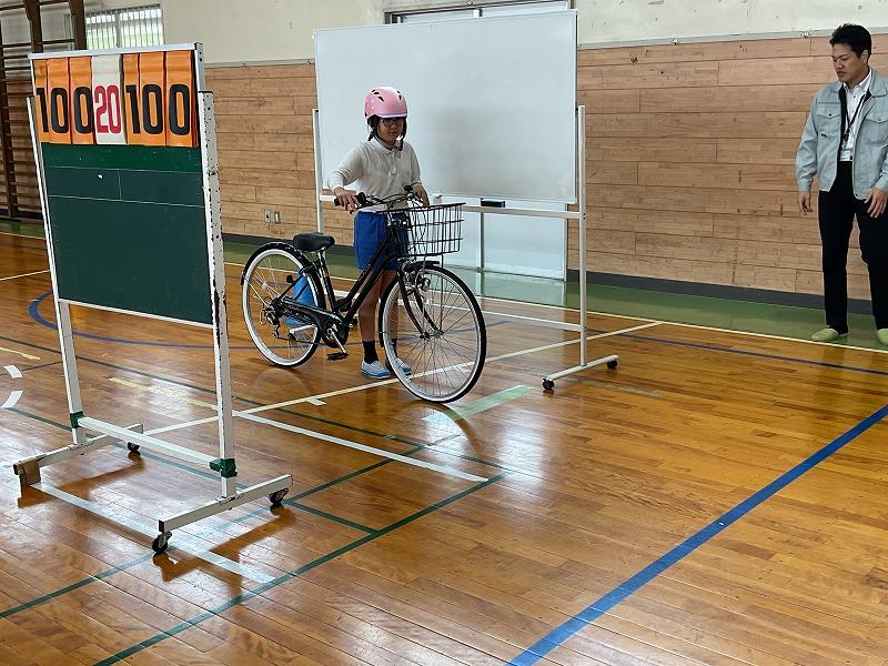 警察署の方からのお話を聞いた後、体育館で実際に自転車に乗りながら、一時停止の仕方や、見通しが悪い交差点での歩行者の確認の仕方などについて学びました。
