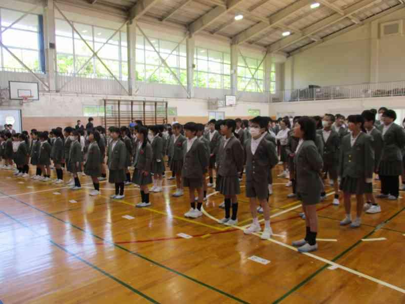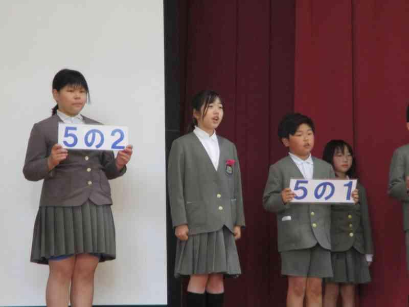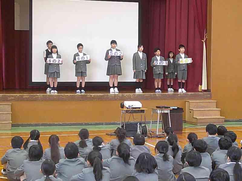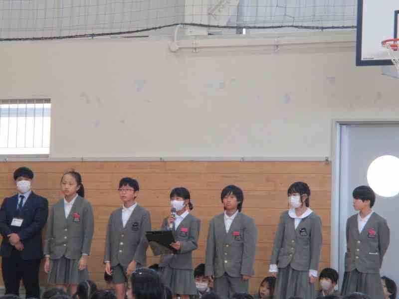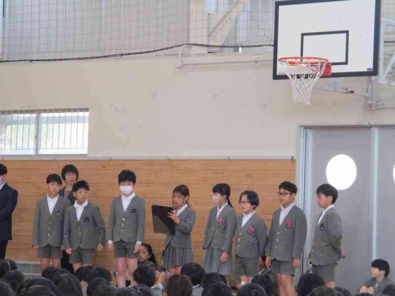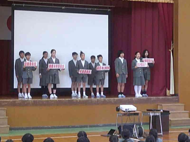 児童集会では、今年の児童会のスローガン「あいさつでえがおあふれるがっこうにしよう」も発表され、児童委員会の委員長と副委員長、学級代表に任命状が渡され、一人一人が決意表明をしました。