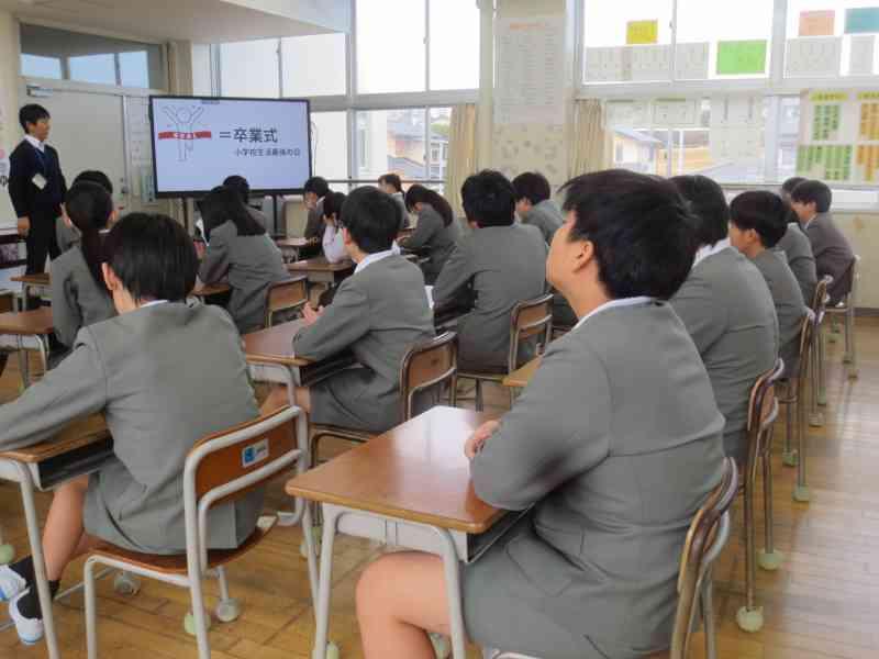 学年集会では、卒業まで残り48日となったことを知り、どんな姿で卒業したいか、そのために卒業までの毎日をどう過ごしていくかなどを自分で考えたり、友達とも話したりしました。