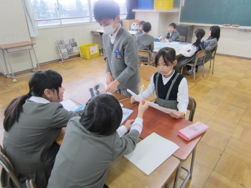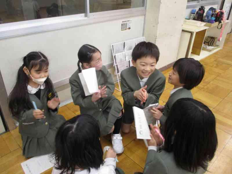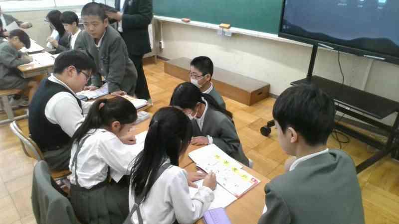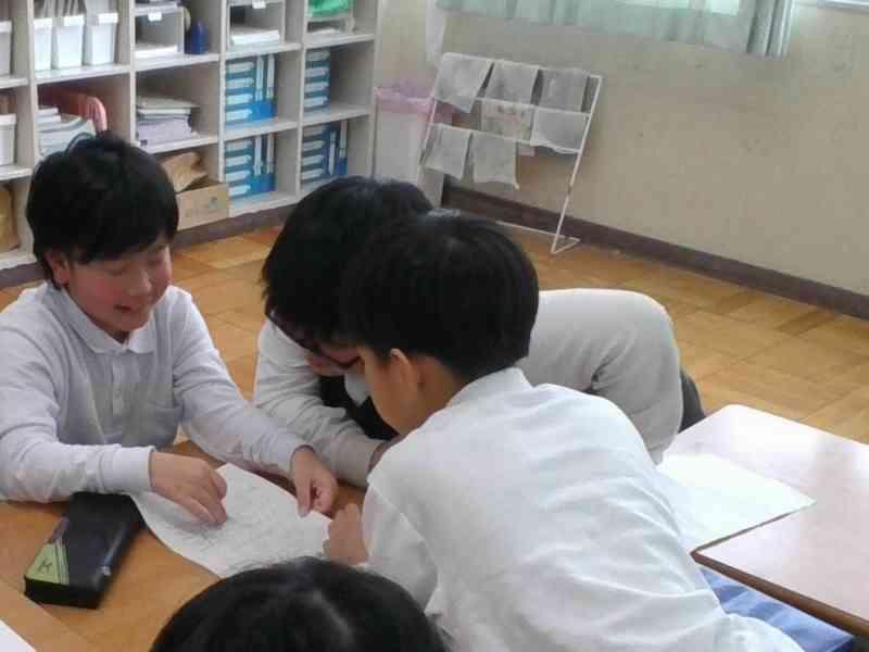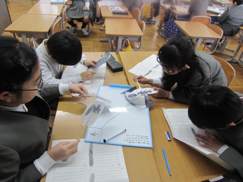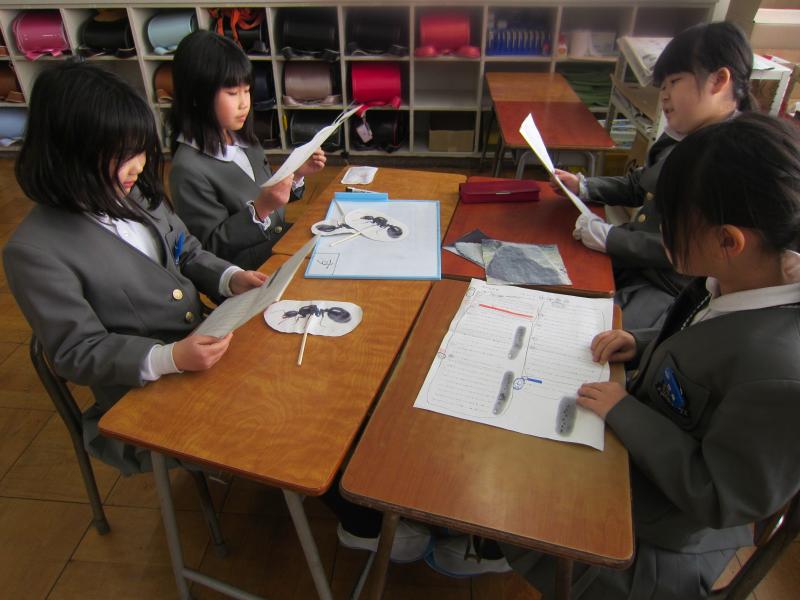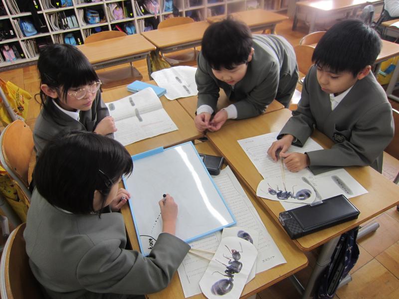 国語では、「ありの行列」を詳しく読んで、わかったことをありのペープサートを使い、動かしながら内容を読み深めていく学習をしています。グループごとに本文を読みながら、「こういうことなんじゃない?」「『散り散りに』ってどういう意味なのかな」「言葉の意味を調べてみるよ!」などと対話をしながら進めていました。友達とともに説明文を読み深め、ありの生態についてもっと詳しくなるといいですね。