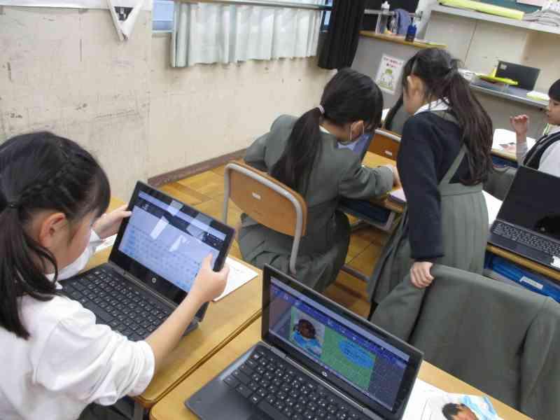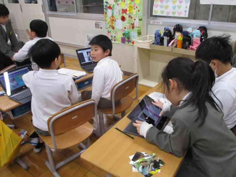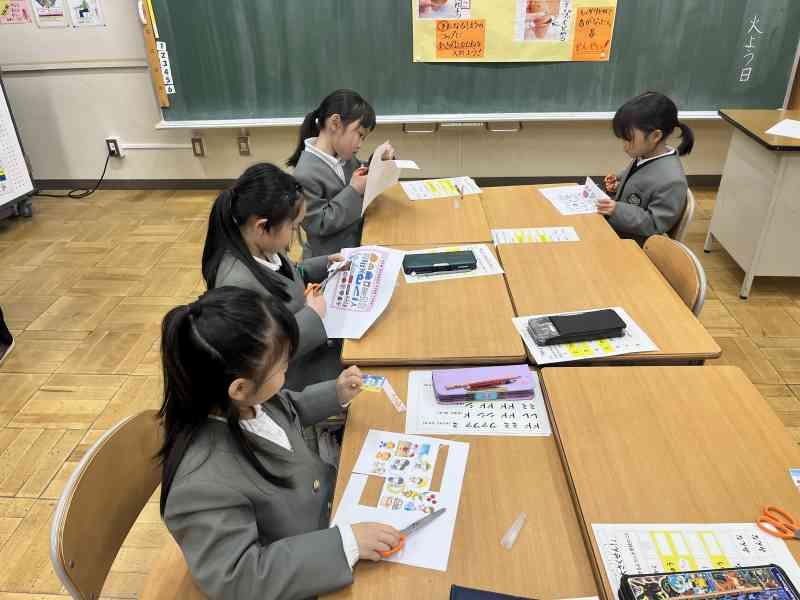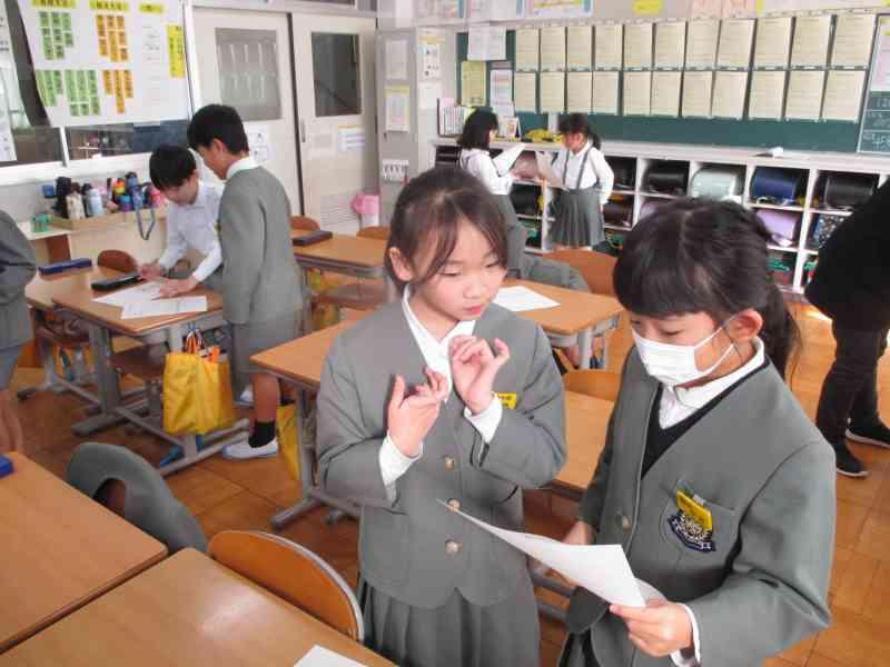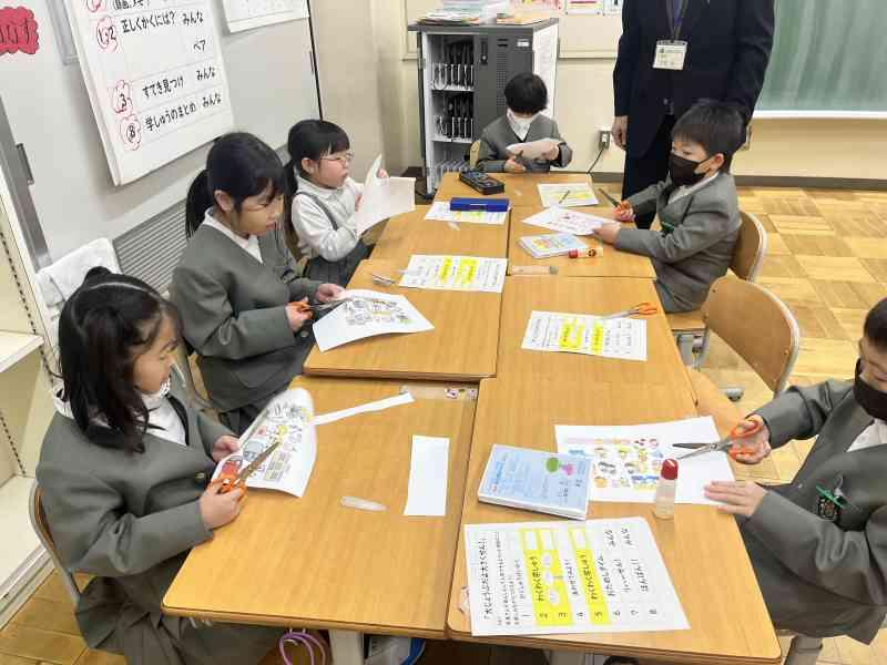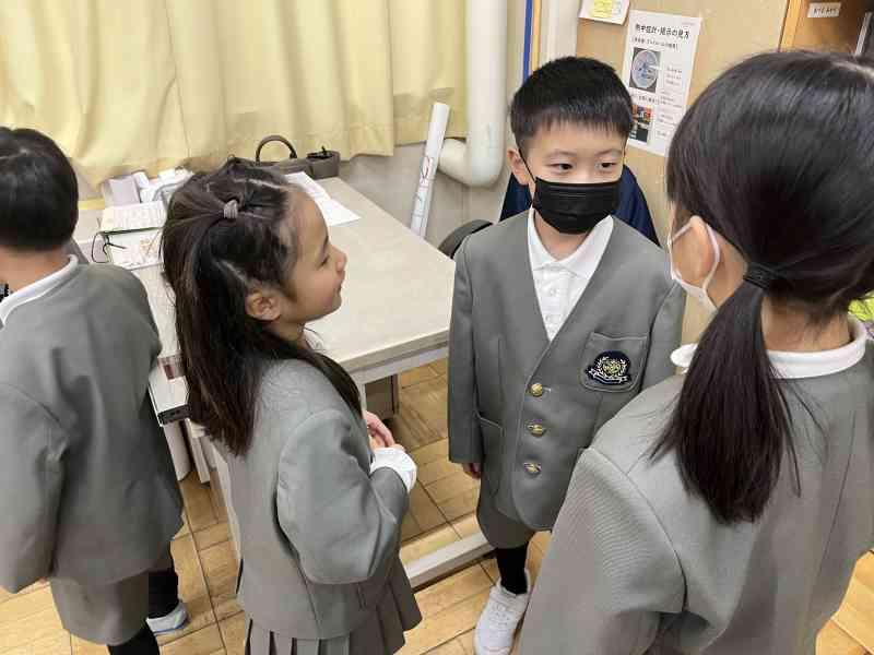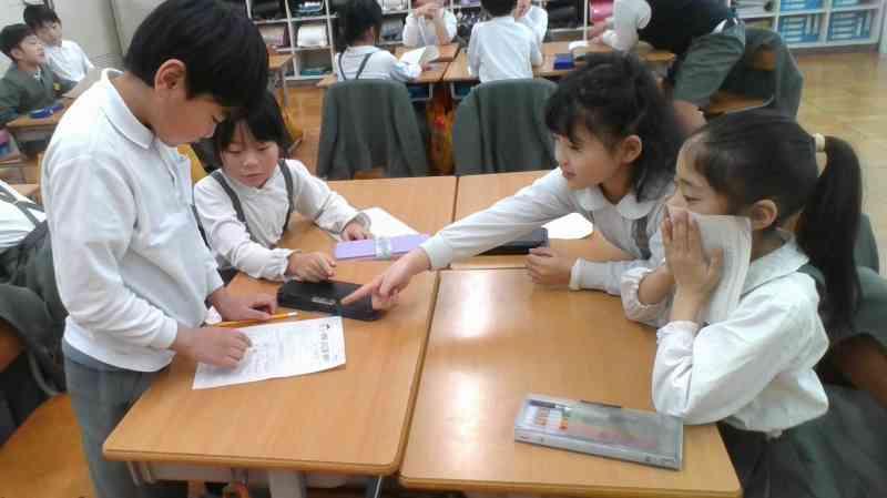 国語では、「ありの行列」を詳しく読んで、わかったことをありのペープサートを使い、動かしながら内容を読み深めていく学習をしています。グループごとに本文を読みながら、「こういうことなんじゃない?」「『散り散りに』ってどういう意味なのかな」「言葉の意味を調べてみるよ!」などと対話をしながら進めていました。友達とともに説明文を読み深め、ありの生態についてもっと詳しくなるといいですね。