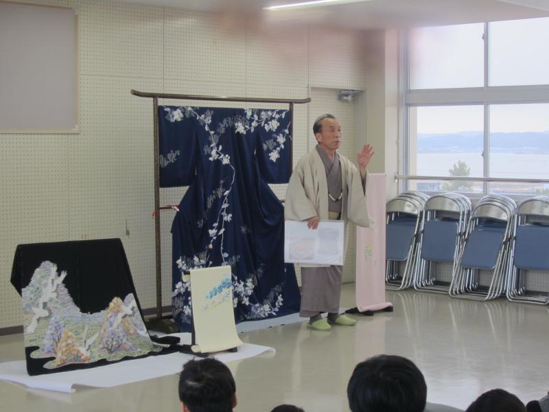 今日は白山市から呉服屋のふくしまさんを招いて、加賀友禅の学習の会をしました。