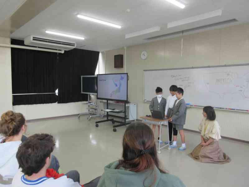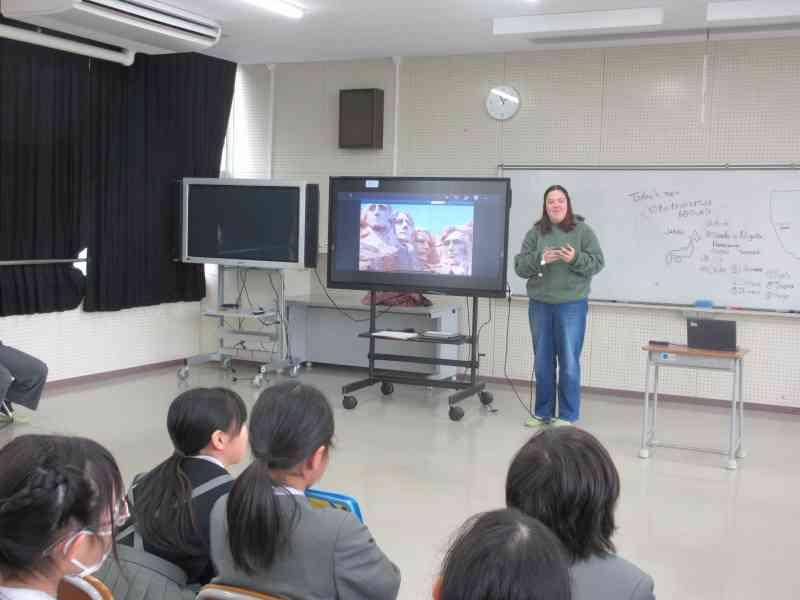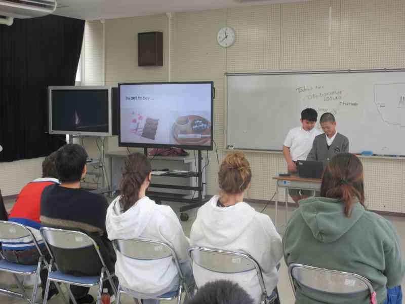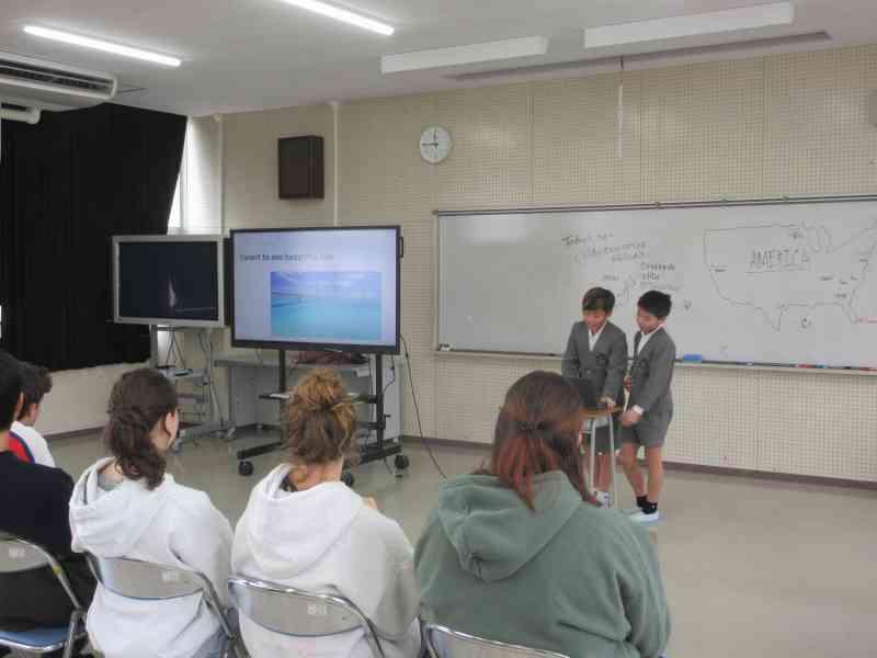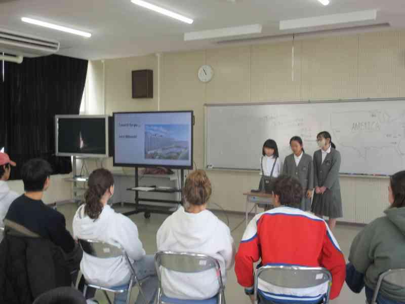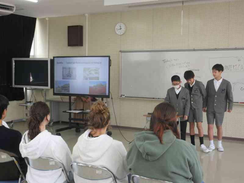 本日、3,4限目に外国語学習で、アメリカの方々をお招きし、交流を行いました。12月から今日の「日本のおすすめスポット紹介」をするための発表準備をしてきました。どちらのクラスも発表後に「Where do you want to go?」と問いかけると、自分たちが紹介した都道府県を言ってもらうことができ、達成感を感じているようでした。