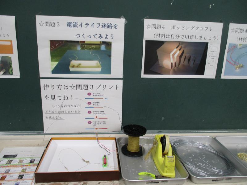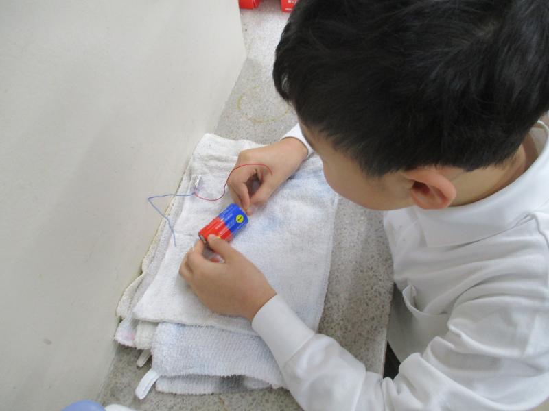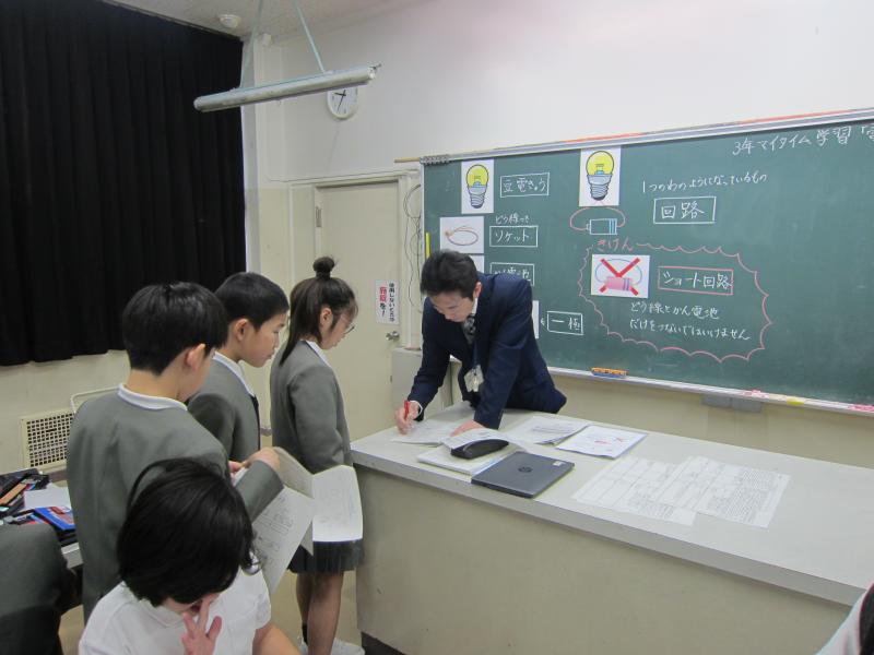 理科では、「電気の通り道」の単元を「マイタイム学習」といって、自分で調べたり試したりしながら個別に進める学習形態で取り組んでいます。「どうやったら電気はつくのかな」「このつなぎ方だったらどうだろう」などと出てきた疑問を子供たち自身で解決していきます。わからない時は友達に聞いたり、教科書を見たりしながら進み、必ず押さえておきたい内容は先生と確かめて学習を進めています。電気を使った工作にも挑戦しています。