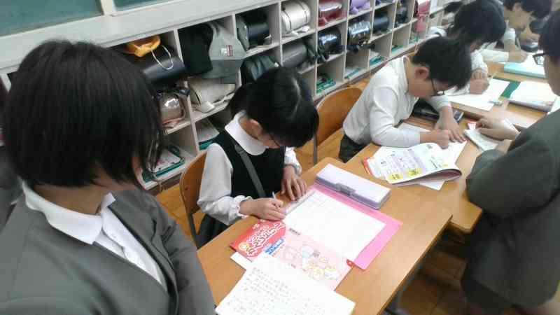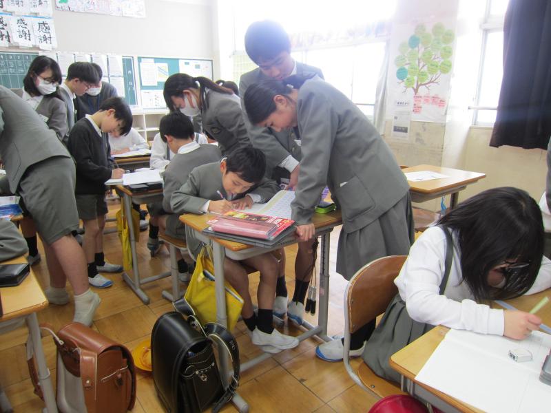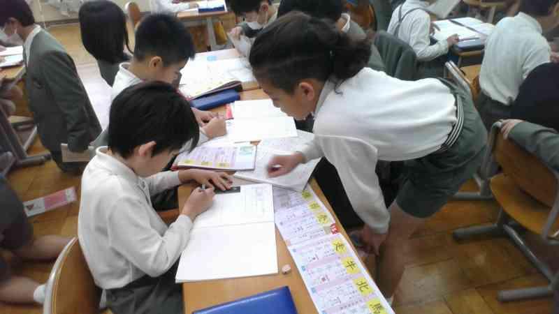 6限後のねぶっこタイムに、3年生は、6年生に自学ノートの使い方について教えてもらいました。いつもそうじで同じふれあいグループの6年生がそばについて、「ここに線を引いて書くよ」「この漢字の画数は〇画だから・・・」と優しく丁寧に教えてくれました。また、6年生の一部では思わず「3年生、字が上手やな」と声があがっていました。やる気がますますアップしていた3年生と6年生でした。