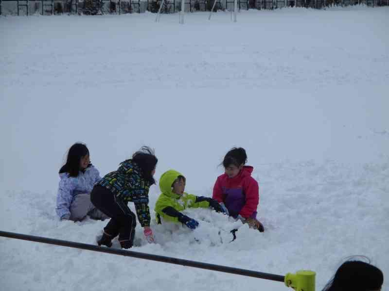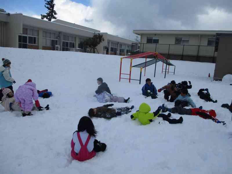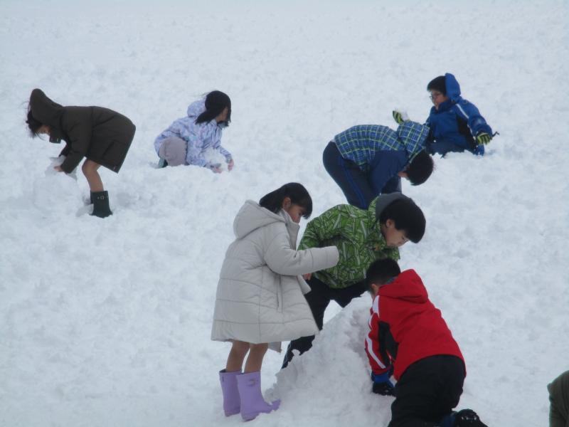 雪がたくさん積もっている運動場を見て、「みんなで雪遊びがしたい!」という声が子ども達の中から出てきたので、学年みんなで雪遊びをしました。