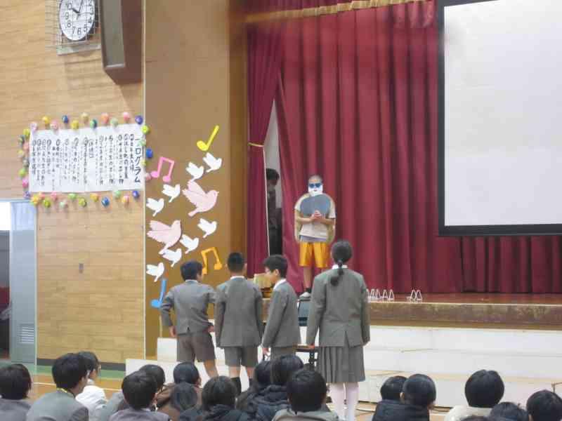 3年生は、劇と歌で元気いっぱい6年生に思いを伝えました。「3年とうげ」というお話から、楽しい有名人がたくさん登場して、見ている人を笑わせたり、元気いっぱいの得意技を披露したりと見どころいっぱいの出し物でした。