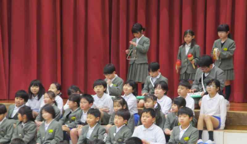 1年生は、手作りの帽子をかぶり、心のこもったメッセージとオリジナルソングを贈りました。楽器を使ったチャイムの音とともに1年生と6年生の思い出が、一つ一つ思い浮かびました。