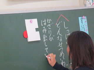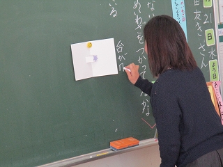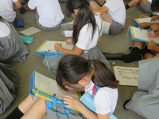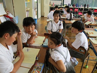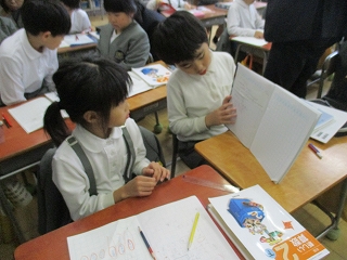 今日は、おすすめの本を「ポスター」「ポップ」「本の帯」のいずれかで紹介することをめあてに、「千年の釘にいどむ」という説明的な文章を題材に、「おすすめポイント」を見つける学習していました。担任の松田先生が出した課題は、<どんなところがおすすめか>です。子ども達は、2つの読みの観点(①登場人物の言動②印象に残った筆者の考え)で、「おすすめポイント」を探していました。この2つの観点は、文章の主題に迫る部分でもあります。自分なりに捉えた「おすすめポイント」について交流し合う場面もあり、この後のポスターやポップ、本の帯作りを楽しみにしながら、読みを深め合っていました。活動を通して、読書に親しみ、本と友達になってくれることを願っています。