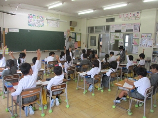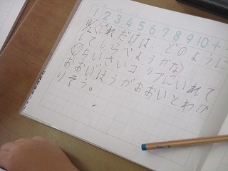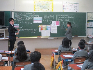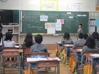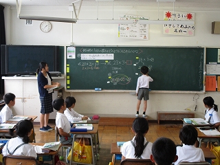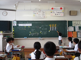 担任の白澤先生は、3年目の若い先生ですが、いつも授業の流れをしっかりと考え、子ども達と向き合っています。今日も、まずは簡単な問題から入りこれまでの学習を想起させてから、本題に入っていました。本題は、「植木鉢が6個あり、1個の植木鉢に3個ずつきゅうこんを植えるには、きゅうこんは何個いるか」というもので、子ども達は、<6×3なのか3×6なのか>について、図を使って話し合っていました。話し合いの中で自分の間違いに気づいた児童もおり、かけ算の式が「1つ分の数×いくつ分」であることを再確認していました。