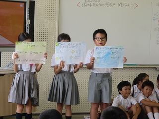 発表を参観し、これまでの学習を通して、「調べる力」「まとめる力」「表現する力」など、さまざまな「生きて働く力」がついたと感じています。また、新学習指導要領で言う「学びに向かう力」「人間性」にも迫れたと感じました。学習は、2学期も続きます。担任の廣田先生、松井先生、川端先生の指導を受け、1学期間で力をつけた子ども達の姿がうれしかったです。