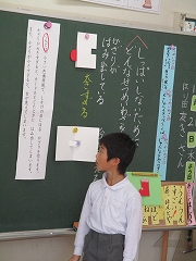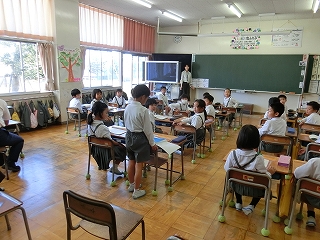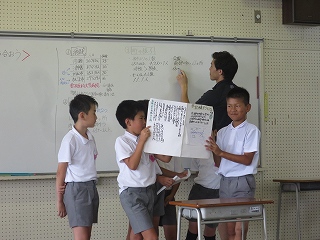 児童は、3つの方法を使った答えの出し方について、実に上手に説明していました。隣の子とペアで説明する場もあり、全員が発言する機会となっていました。ペアでも全体でも全員が生き生きと説明する姿は、もうすっかり成長したお兄さんお姉さんでした。
