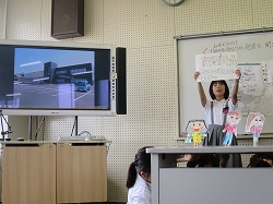 ペープサートと、クイズで説明していました。お店の紹介ということで、写真を大型テレビに映すという工夫もありました。ペープサートには、町のヒーロー(子ども達自作のキャラクター)が登場し、ヒーローによるとお店にはお年寄りにやさしいいろいろな工夫があるということでした。