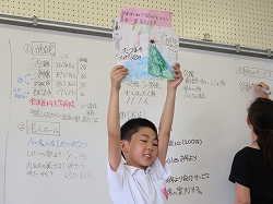 こちらのグループも、ペープサートと図による説明を組み合わせて発表していました。タクシー料金や税金といった金銭面でも、お年寄りにとってやさしいサービスがされていると、分かりました。