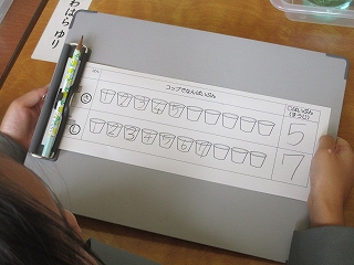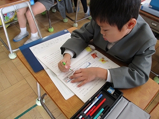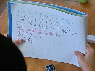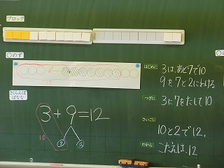 今日の課題は、<(3+9のように)まえのかずが小さいたしざんは、どうするかな>でした。子ども達は、前の時間に「9+〇」「8+〇」のような前の数が大きい計算について学習しています。今日は、その時の学習をもとに、3つの方法(ブロック・図・式)で計算し答えを出していました。算数は既習がとても大切です。前に習ったことをもとに考え、どうしたら答えを導き出せるか思考します。最終的に、繰り上がりのある計算は、答えを暗記してしまわなければなりませんが、どうやって答えを出すか考えることが、今後、学年が上がった時に自分の考えを生み出す力となっていくのです。