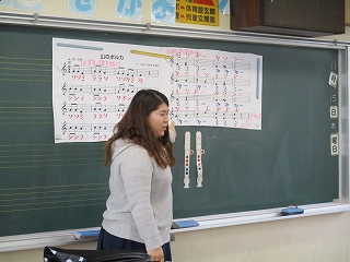 児童が話し合った結果、なめらかな演奏にする方法は、「のばす所に気をつける」「音符の長さを守る」の2つでした。この考えが出たところで、中村先生が、3つの音符(4分音符・2分音符・8分音符)の長さを確認。児童は、伸ばす音や音符の長さに気をつけながら何度も練習し、最後に全体で合わせ、演奏を完成させていました。いっしょに合わせた時に、どうしても音の長さが合わずずれてしまう場面もありましたが、何度も挑戦しよい音楽を追究する中で、それぞれの感性が磨かれていくのだと感じました。