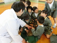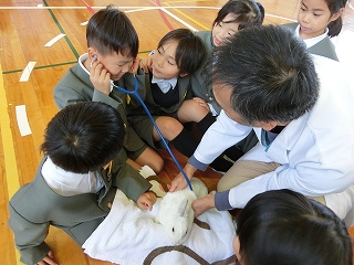10日の午後から、獣医師さん11名にご来校いただき、1年生全体でうさぎとのふれあい体験の授業をしました。112名の1年生が体育館に集まって、かわいいうさぎを抱っこする活動、楽しいに違いないけど、大騒ぎになるのではないかなとやや心配でしたが、獣医師の田村先生の「うさぎは大きな耳だから、音に敏感です。大きな声や音を出すととっても怖いんだよ」「うさぎも『怖いな』『寂しいな』『嬉しいな』という気持ちが、みんなと同じようにあるんだよ」「うさぎが喜ぶキラキラ言葉を言ってあげてね。絶対にみんなの気持ちは伝わるよ」というお話をしてくださったので、100名以上の1年生は、一人一人、精一杯心を使って触れ合いました。静かに順番にそっとうさぎを抱っこして「かわいいね」「だいすきだよ」というキラキラ言葉をかけている1年生の表情や姿の純粋さに、大人の私は感動してしまいました。やさしさに溢れた1時間でした。獣医さんやお世話くださった内灘役場の方、本当にありがとうございました。