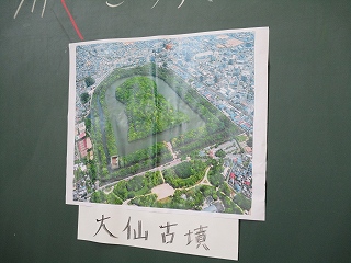担任の城崎先生が提示した大仙古墳の写真や、資料集にある古墳づくりのイラストから、子ども達はいろいろな事実に気付き、そこからたくさんの疑問が出されました。