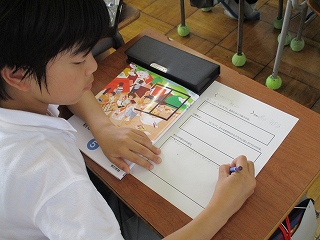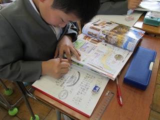 「だれのお墓なのか。」「どんな大きさなのか。」「どのくらいの期間で、どのようにして作ったのか。」など、古墳そのもののについての疑問と、「なぜ、作ったのか。」「なぜ、そんなに大きい古墳なのか。」という、当時の人々の思いや時代背景に迫る疑問が生まれ、教科書と資料集から集中して真剣に調べる児童の姿が見られました。分からない言葉に出合った時、国語辞典で調べることも学習習慣として身についているようでした。