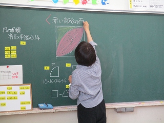 今日は、6年2組の算数の授業を参観しました。担任の板井先生が出した課題は、「赤い部分の面積(写真参照)は、どのようにして求めればよいか。」でした。見ての通り、これまでに習った内容(既習)を生かして求め方を思考していく課題です。まずは、先生といっしょに正方形の面積、円の面積を求める公式を想起し、どうすれば赤い部分の面積が求められるか大まかに確認した後、個々の思考の時間となりました。