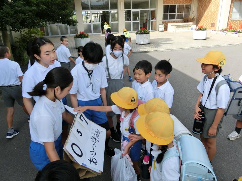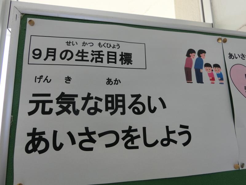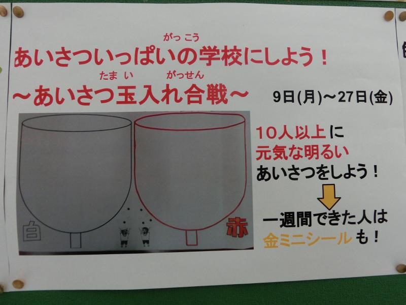 学校では、9月の生活目標「元気な明るいあいさつをしよう」の取組として10月に控えた運動会にちなんで「あいさつ玉入れ」を行っています。