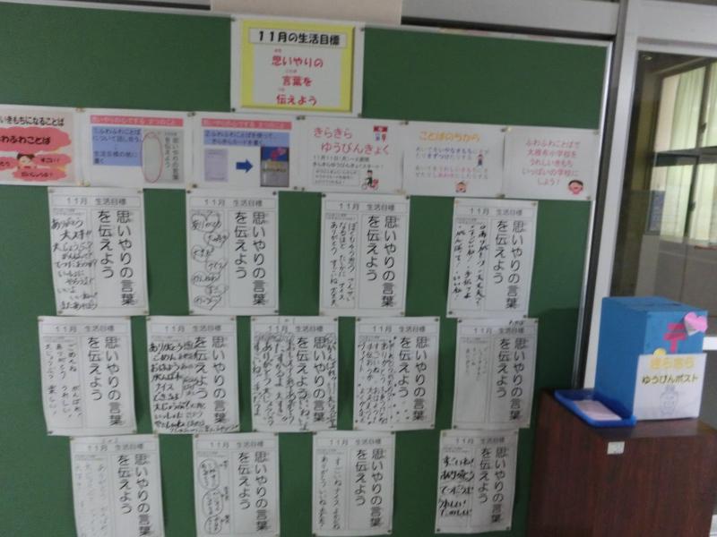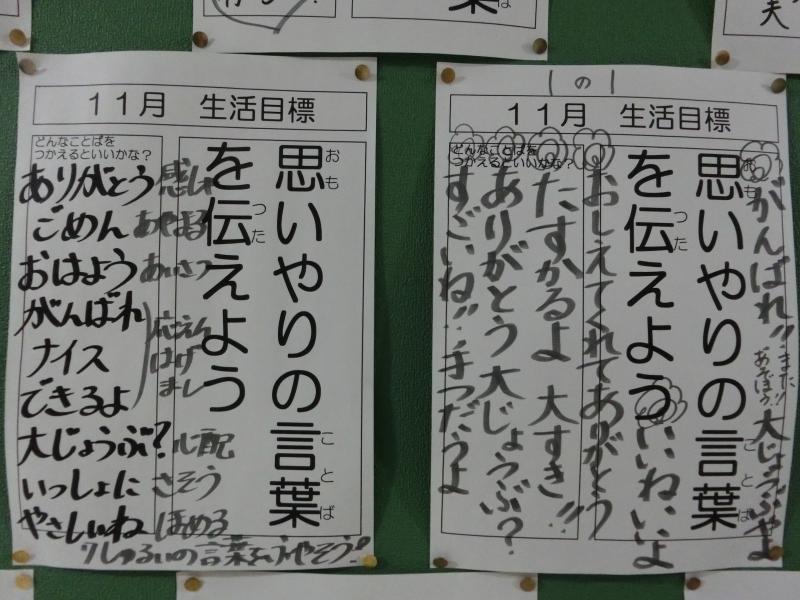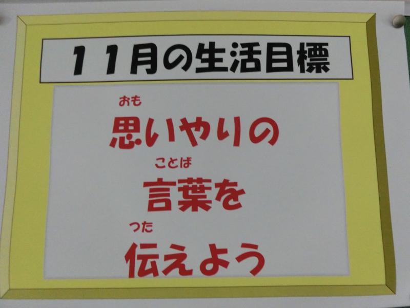 11月の生活目標は「思いやりの言葉を伝えよう」でした。各クラスでたくさん集めた「ふわふわ言葉」を使って思いやりのメッセージを届けようという取り組みを行いました。