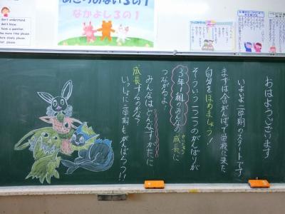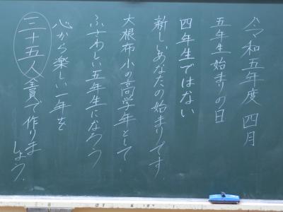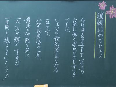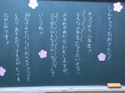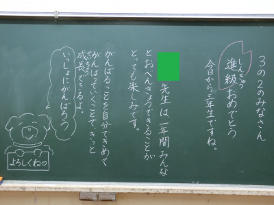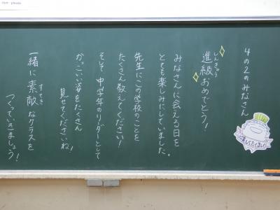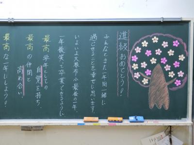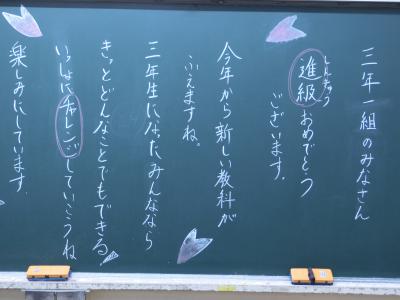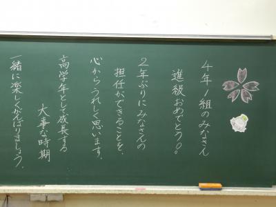子ども達は1つずつ学年が上がり、下駄箱の場所や教室の場所も変わります。担任の先生方は、子ども達と一緒に充実した一年を過ごそうという気持ちを込めて各教室の黒板にメッセージを書いていました。