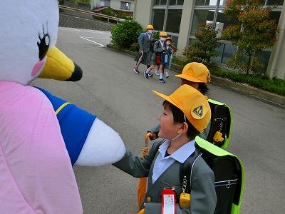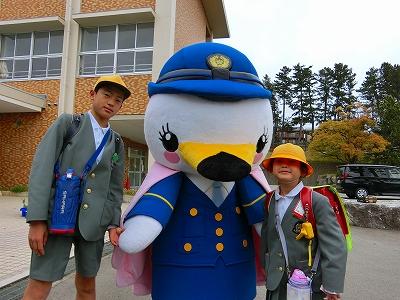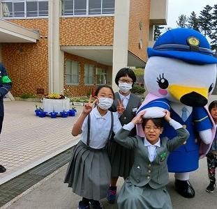 中でも人気は、白鳥係長。特に低学年の子ども達は、握手をした後、「かわいい」「ふわふわ」と大喜び。教室に行ってから、また、玄関に出てきて白鳥係長を取り囲む子もいました。