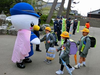 津幡警察署の署員の方々と日頃から児童の登校時間に見守りをしてくださっている防犯ボランティアの方々です。