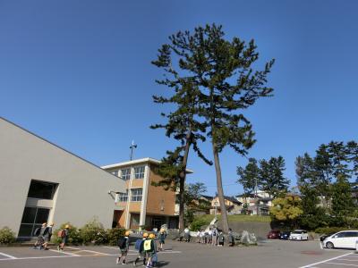 伐採後の5月1日月曜日のロータリーには、2本の松が誇らしげに伸びています。元気な2本の松の下で、元気いっぱいに挨拶する子ども達。挨拶運動をしている様子も安心して見ることができました。