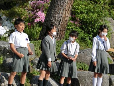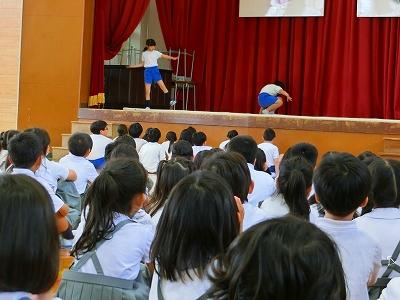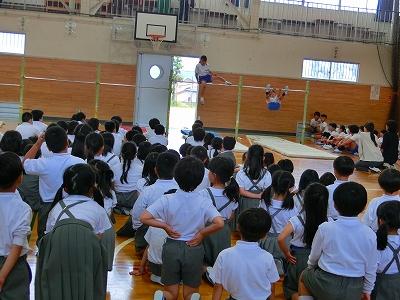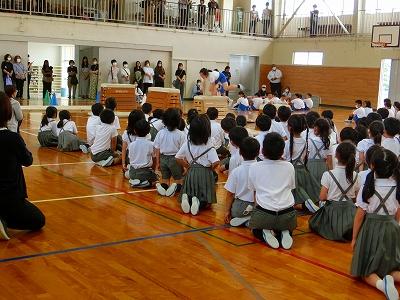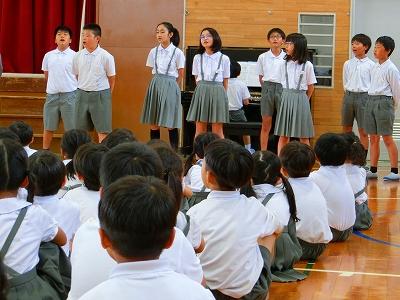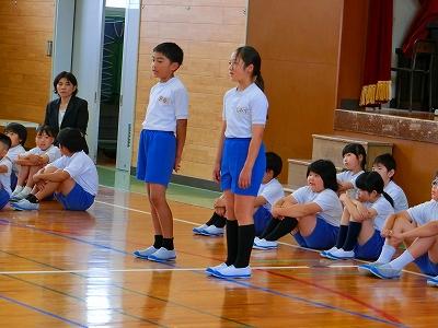 そして、4限目は、児童集会を行い、5月31日に行われた器械運動交歓会の成果を4年生が発表したり、6月14日に予定されている音楽会の演目を五年生が発表したりする様子を参観していただきました。