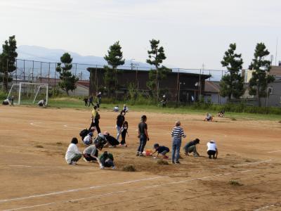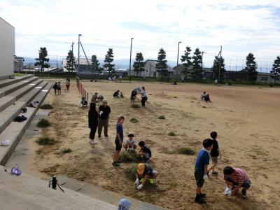 10月7日には運動会を予定しています。毎年、運動会の時期になると運動場の雑草が目立つようになってきます。そこで、本校では、毎年、運動会前にPTAの方々のお世話で、奉仕作業をおこなっています。
