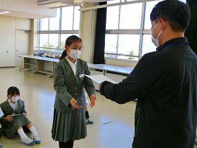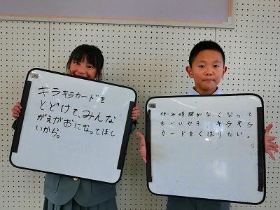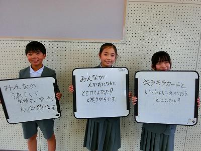 そこで、9日(水)の昼休みに、キラキラ郵便局員さんの入社式を行いました。局長は、堀田先生。堀田先生から任命書が一人一人に手渡されました。郵便局員は中学年の4学級からそれぞれ2名ずつが選ばれています。みんな立候補してくれたそうです。郵便局員になると、朝休みはポストのお手紙回収、長休みはMVPのお手紙の選出、昼休みは配達と、休み時間がなくなってしまいます。大変なお仕事ですが、入社の動機を聞いてみると「みんなに笑顔を届けたいから」「休み時間がなくなってもいいから、みんなのためにキラキラカードを届けたいから」と温かい言葉が返ってきました。