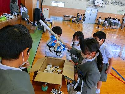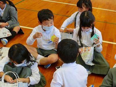 2年生が1年生を招待して生活科の「おもちゃランド」を開くというので、体育館へ見学に行きました。1年生が楽しめるおもちゃを2年生が作ったとのこと。それぞれのお店をのぞいてみると、全てリサイクル工作。捨てるはずだったペットボトル、牛乳パック、段ボール、食品ラップの芯、お菓子の箱など捨てればゴミだけど、上手にリサイクルして1年生が楽しく遊べるおもちゃに変身していました。