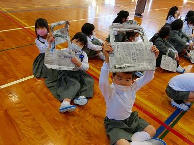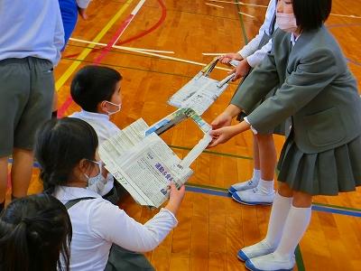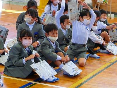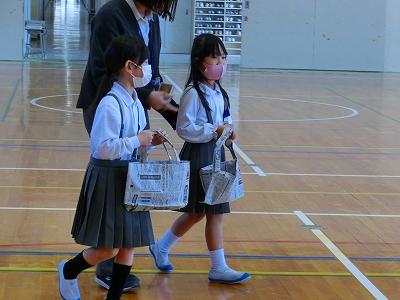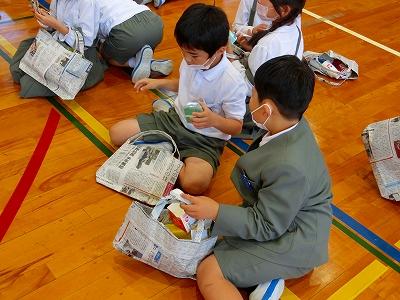さらに素敵なことが!1年生がお土産を持ち帰るためのエコバッグも新聞紙で2年生が作って準備していました。おもちゃランドオープンの前に、2年生からバッグをもらって期待も膨らみます。