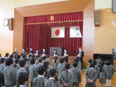 今日は、春休み中の子ども達が、久しぶりに登校し離任式を執り行いました。