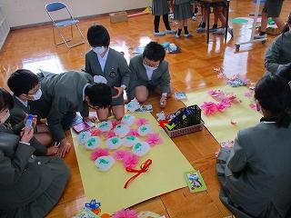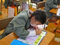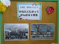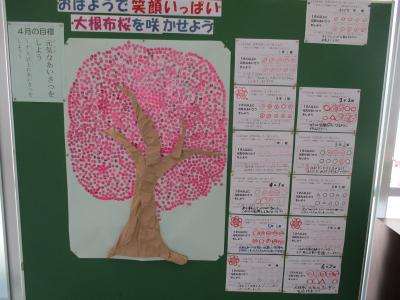 児童の毎日の挨拶の積み重ねで満開の桜の花をさかせている大根布桜です。毎朝10人以上に挨拶をするとピンクのシールを1つ貼ることができます。みんなで10人以上の挨拶を積み重ねていき、大きな大きな桜の木になりました。桜の木の横には、クラスの目標も掲示してあります。