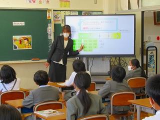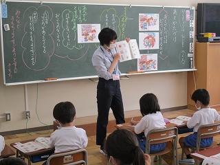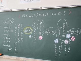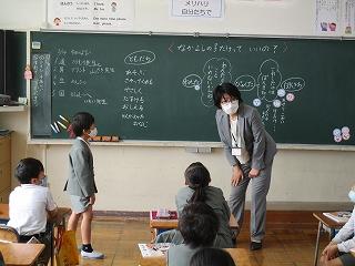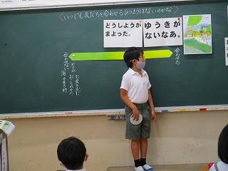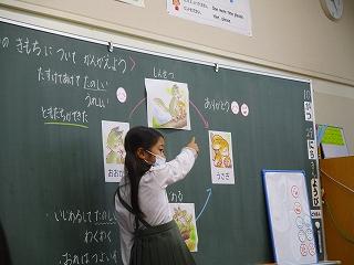 テーマは「ともだち」で、役割演技で登場人物になりきって気持ちを考える場面があり、演じている子はもちろん、それを見ている子供たちもお話の中心となる場面の心情を深く考えていました。低学年なりに「ともだち」とはどうあるべきかを楽しく学べていました。