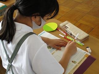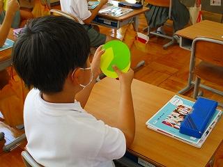 今日のお話に出てくる「ぼく」は、流れの速い川のうずに、かさを流してみないかと友達に誘われます。ここで、担任の岡田先生は「自分だったら、友達に合わせる?それとも合わせない?」と問いかけました。子供たちは、その時の気持ちを黄(友達に合わせて流す)と緑(友達に合わせない)の円盤で示しながら、わけまで詳しく話していました。面白そうだからやってみたいという気持ちと、やってはいけないことだという気持ちと、両方の間で揺れながらみんなで話し合ううちに、自分の気持ちに変化が生まれた子もいました。素直に話せるねぶっ子たちの、道徳の時間の発言にはいつも感心させられています。