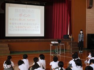 今日は、「授業で話を聞くときのポイント」について、6年生の国語の授業を例に話しました。ポイント①は、自分と同じ考えか違う考えかしっかり聞く ポイント②は、相手の意見が自分と違っても一度受け入れなるほど、なっとくと思うことを自分の考えに取り入れる ということです。なるほど、納得と思ったら、そのことを友達に伝えることも互いに学び合う上で大切なことです。「思いやりをもって協働できる子」が増えるほど、関わりの中で全体として子供たちは育ちます。1・2年生にはちょっぴり難しい話でしたが、3年生以上がしっかり聞いているので、小さい子なりに理解していたと感じています。